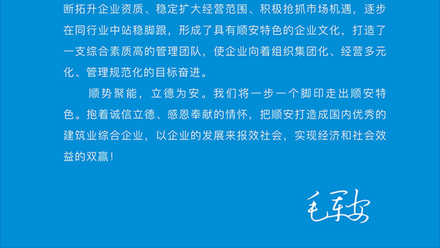 我們始終堅持“用戶至上、安全第一、質量第一、信譽第一”的宗旨。從歷史中吸取力量,從理想中獲取希望,以協作謀共贏、以務實固基礎、以奉獻筑品牌、以學習促轉型、以創先求突破,切實努力將順安公司打造成為人才素質高、技術實力優、社會聲譽好、競爭能力強的施工企業,竭誠與社會各界精誠合作,攜手開創順安輝煌的明天!